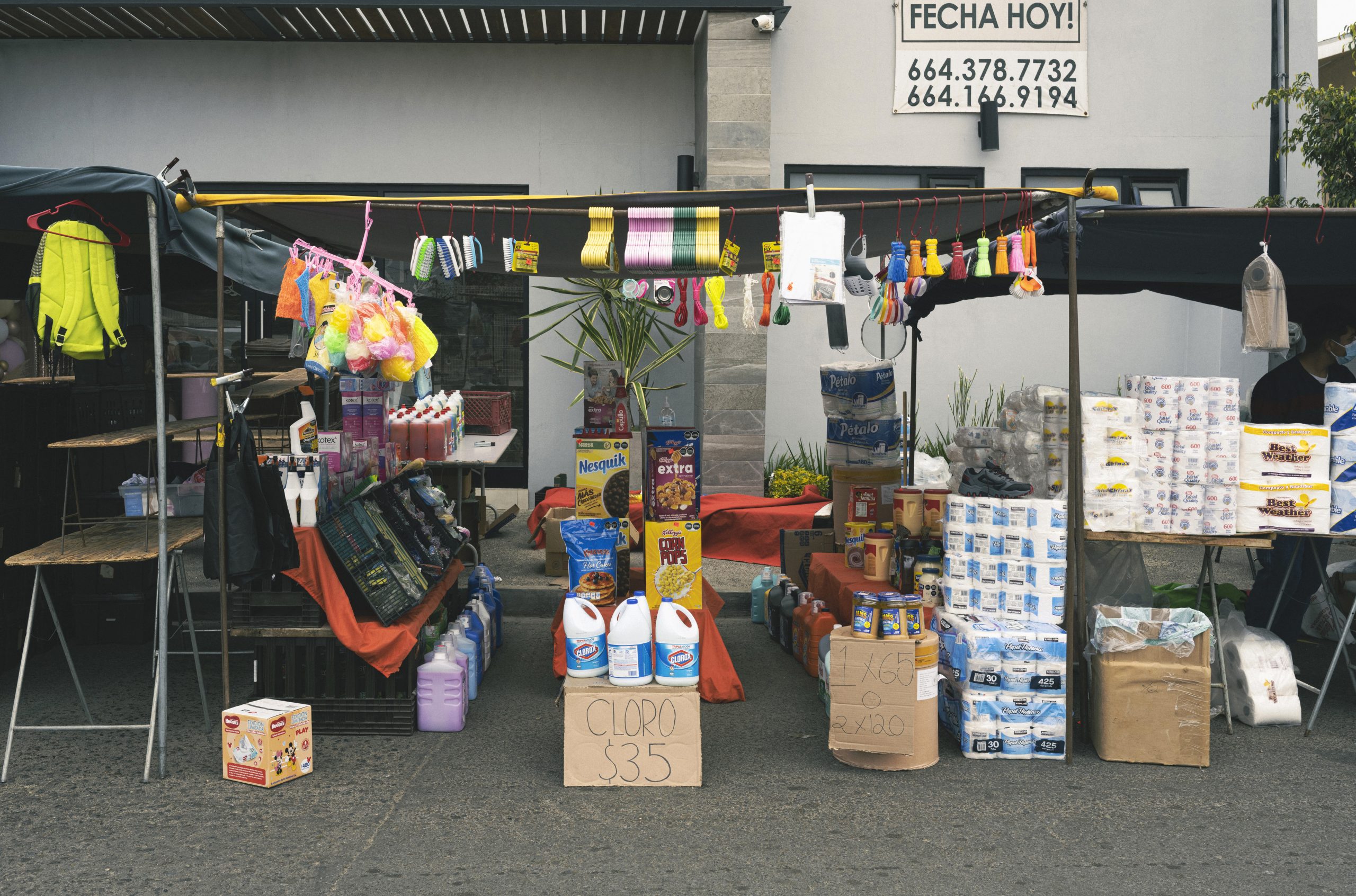 In the “sobres” (an abbreviation of sobreruedas) you can find everything from fresh produce to electronics, from home furnishings to vintage records, toys, and collectibles, and all kinds of second-hand items sourced across the border from thrift stores, swap meets, and yard sales in San Diego and other Southern CA cities. Alongside these items traditional street foods like birria, carnitas, and sopes are prepared in all manner of regionally specific styles, to cater to patrons who have migrated north, “al norte,” to the border city of Tijuana from the interior of Mexico. Increasingly, you also see international foods from throughout Latin America, like Salvadoran pupusas and Haitian chicken, a result of recent waves of migration from the global south to the border. Markets in our local border region continue to serve as a landing mat for those far from home, as they create new enclaves of belonging in our region while awaiting legislative decisions that will determine their fates—a limbo that many migrants have had to endure because of cruel and unjust restrictions imposed around seeking asylum as a result of the implementation of Title 42 at the onset of the pandemic. In recent months, community members have shared that they have even seen the emergence of culturally specific markets within markets that sell products from the Caribbean and Central and South America. The resulting brunch-time fusion of dishes and flavors made possible by markets is something that we and the other visitors to the sobres relish and look forward to, making the fugitivity of migrant gestures palpable and tastable as part of the everyday.