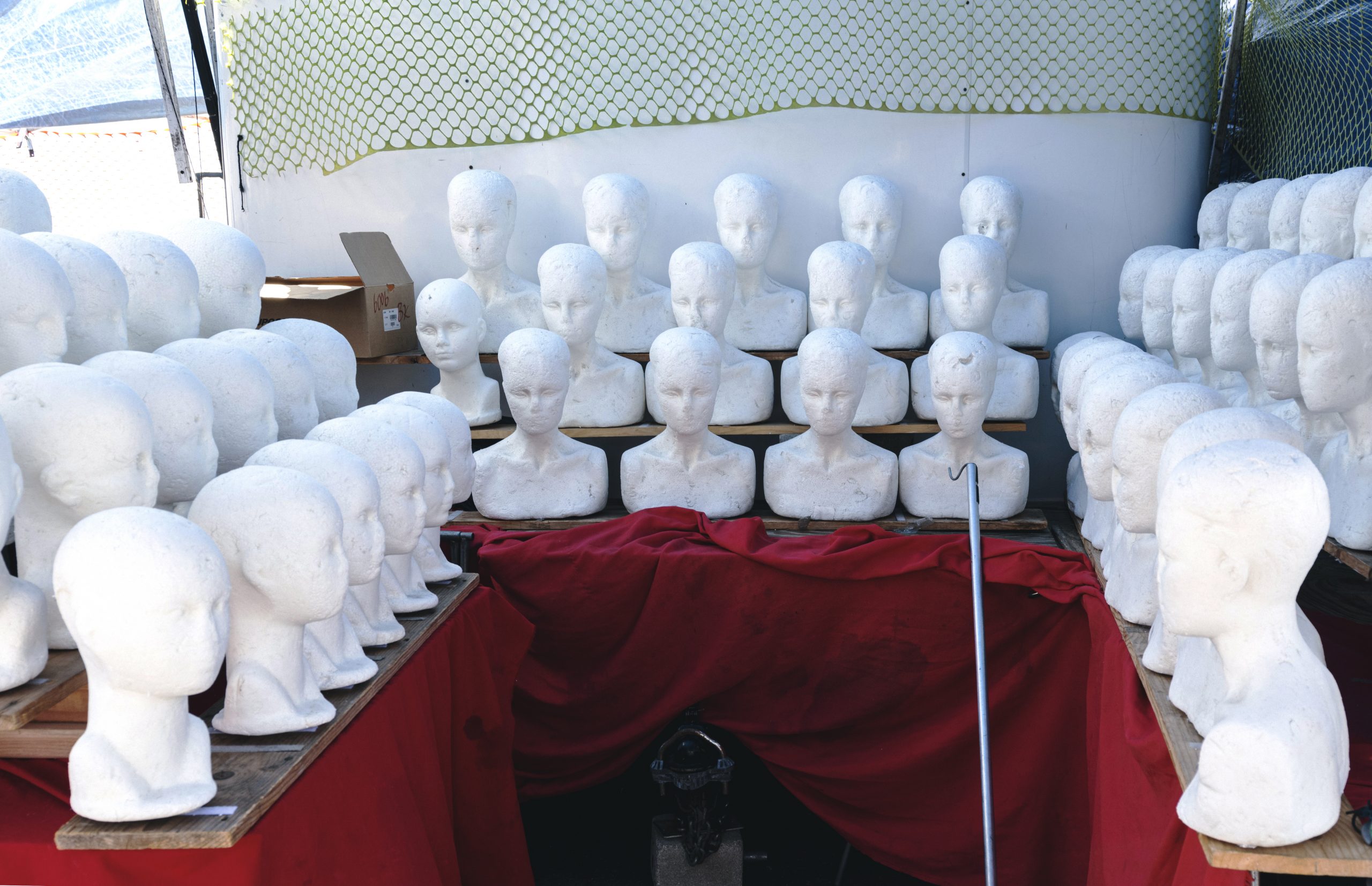 We look through the bolts of fabric of numerous textile vendors, then head to the secondhand section of the market looking for mirrors for a project we will undertake in this very swap meet in about a month’s time. As we dig through a box—which contains a dirty blue care bear, a dish rack, some fancy dinner napkins, a treat puzzle for cats, lots of boxes of paper clips, a vibrator, shoes that are probably too worn to be resold, and numerous other oddities—the man in charge of the stall yells from the back: “¡Ya vamonos! ¡Que pinche calor!” He lets us all know that everything on the table beside us—mostly clothing and home goods like blankets, curtains and pillows—is now free. He would rather not pack everything up and take it back to Tijuana, he says it’s too much effort. He is jubilant in this announcement, like he knows how delighted this makes all the patrons. Immediately we gather around the table and begin hunting for our treasures.