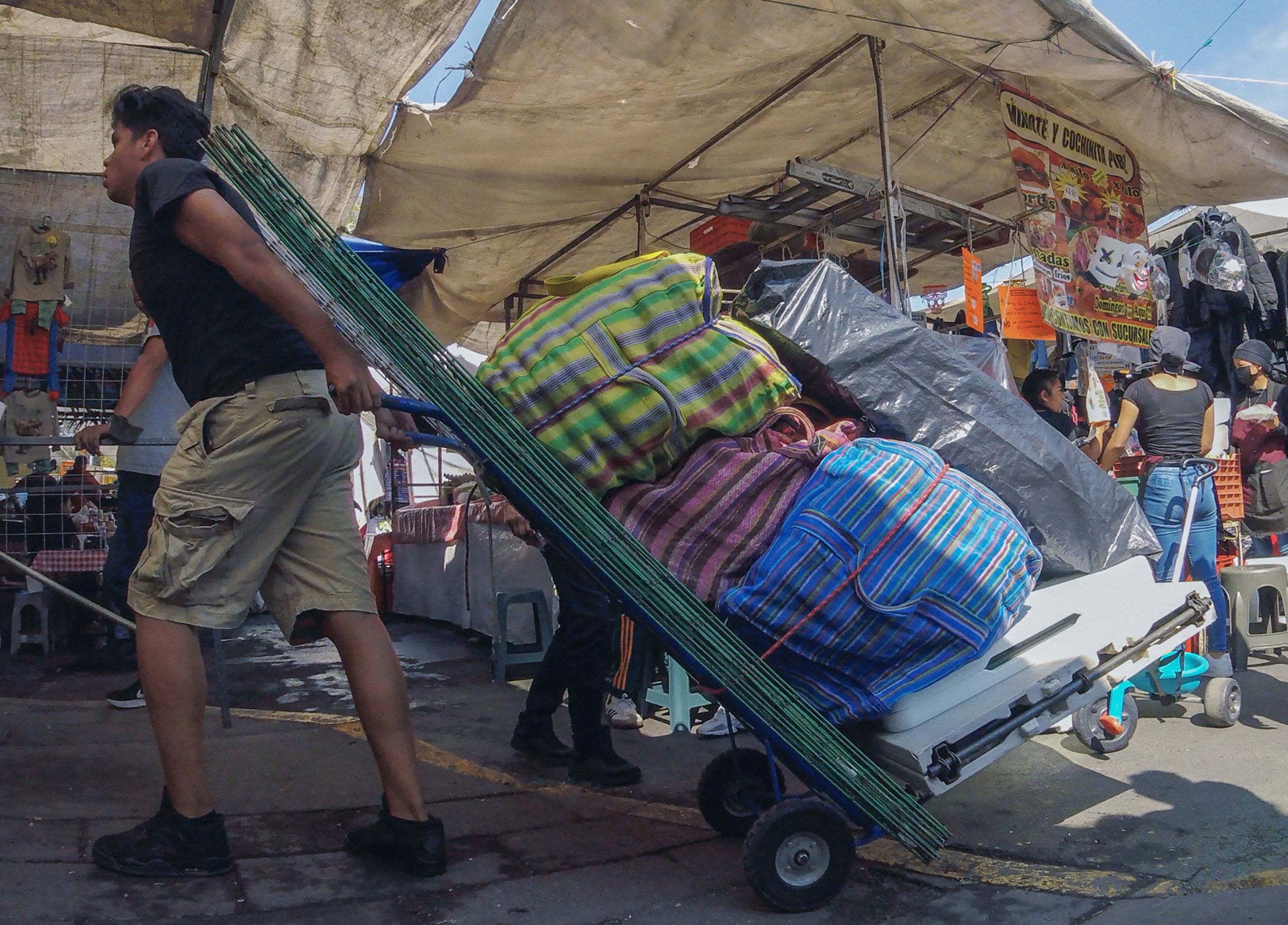 Venimos a dominguear—”we came to Sunday.” Mexico City is hot, in the middle of a heat wave, and the air smells like humidity, traffic, ripe fruit, and grilled meat—like street market deliciousness. We’re both sweating profusely under our face-coverings which about half of the people in the market have on.
