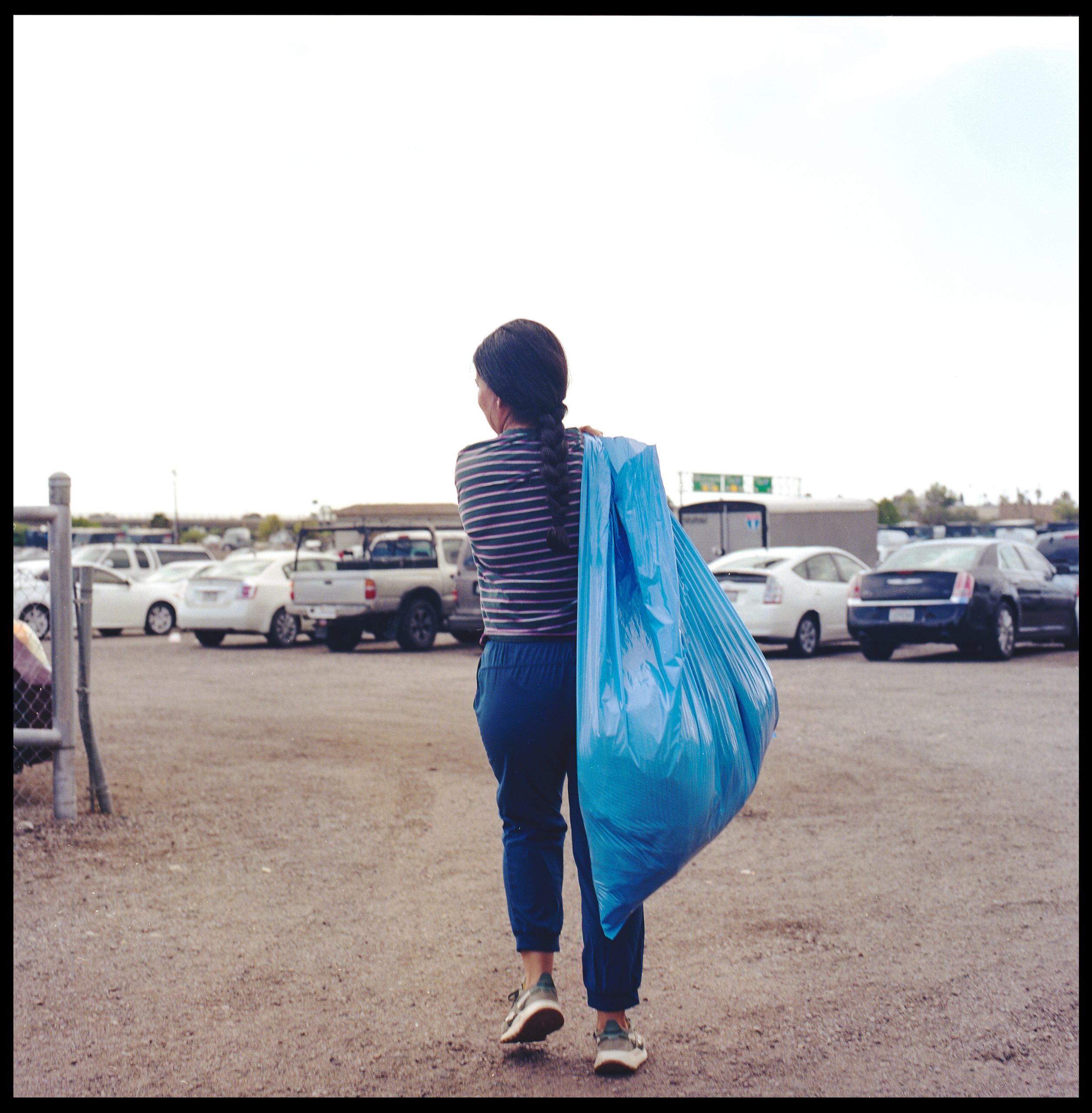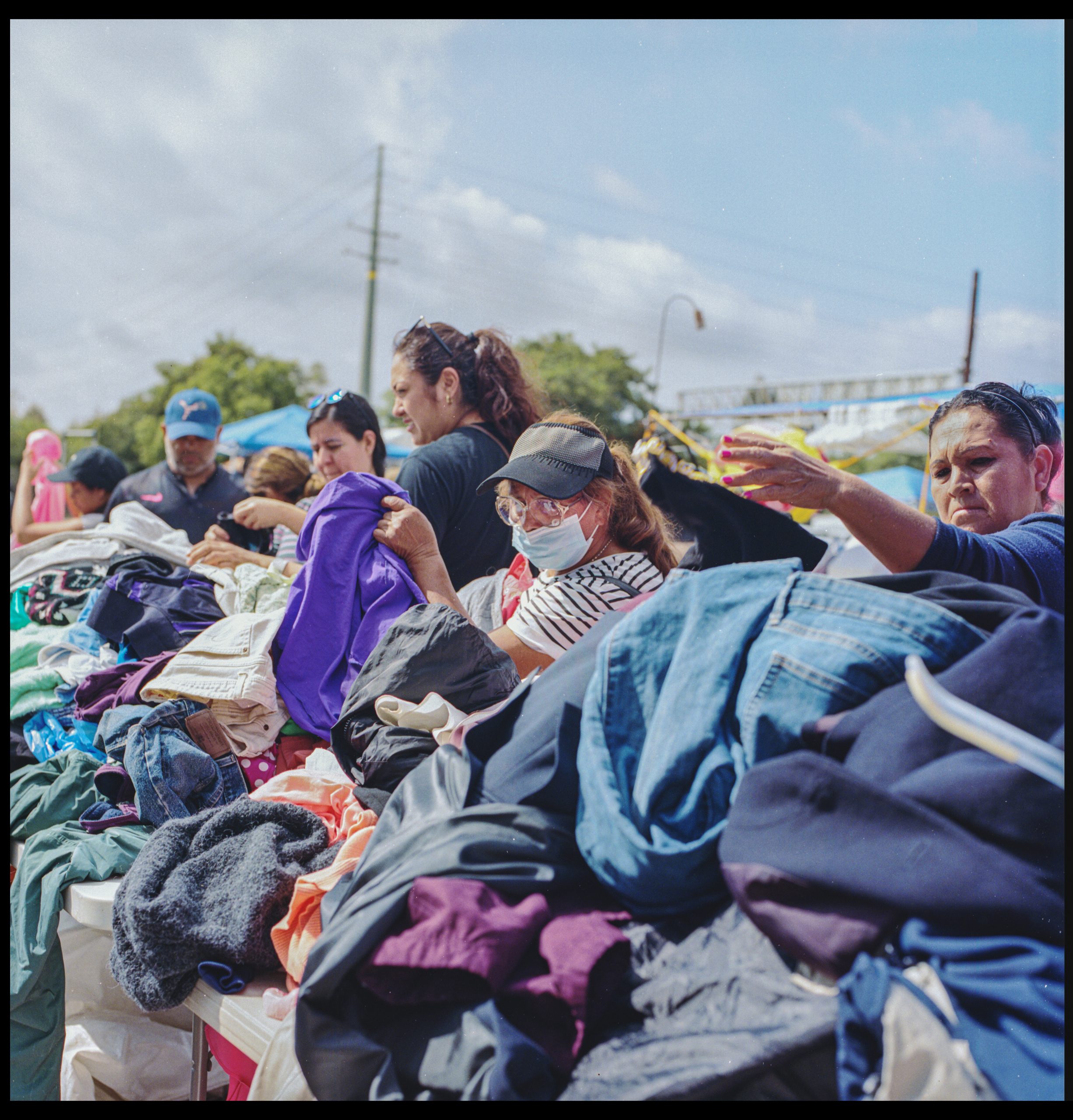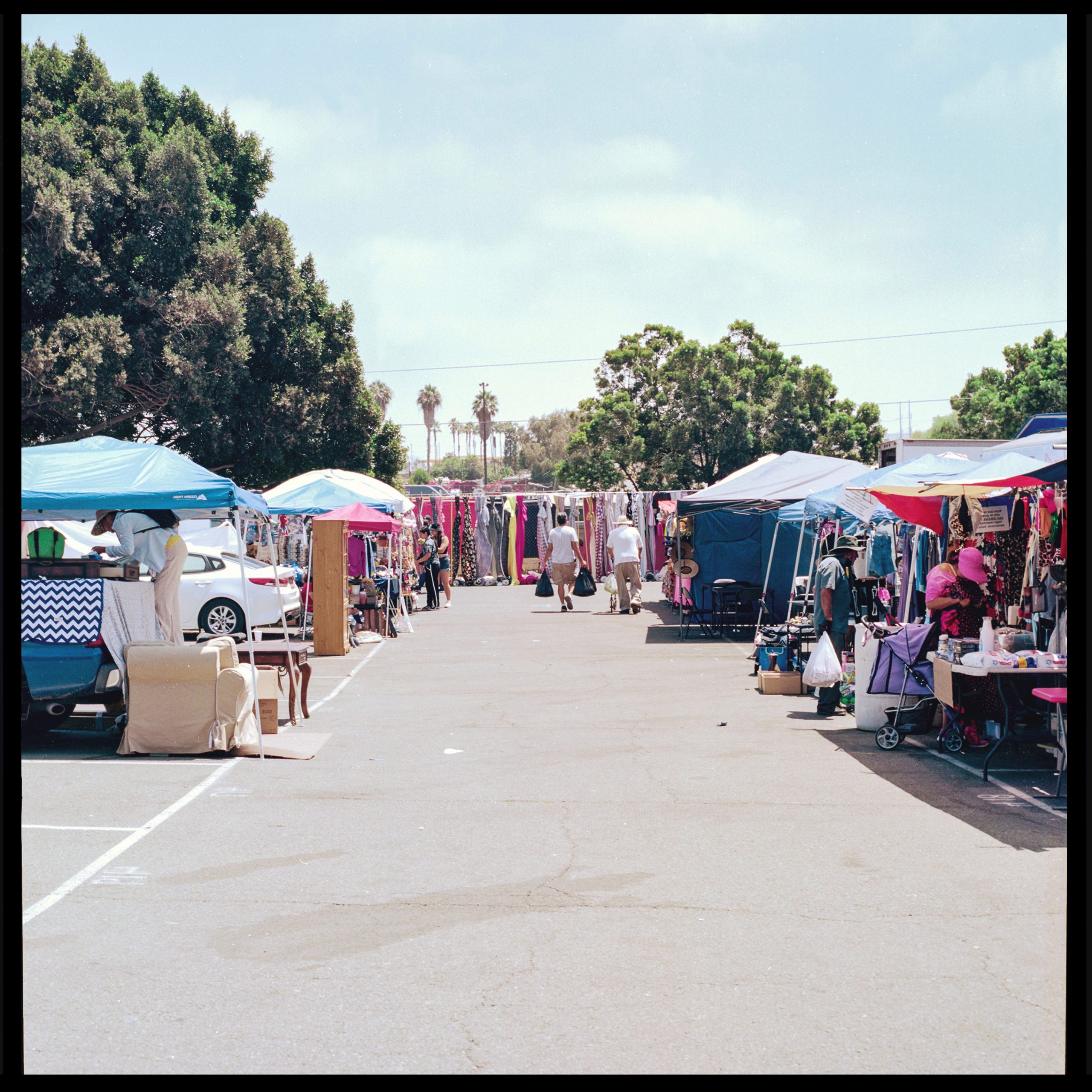 A pair of sisters who look in their 70s ask us for help finding the matching pair of pants for a silky pajama top, as they begin to hold items up to us because they say that we’re about the size of their grandchildren. They ask us about the camera we’re carrying—a medium format camera from the 80s—and we tell them that we’re artists and that we make work in and about markets. They congratulate us and tell us how they’ve been coming to the National City Swap Meet for decades, how it used to be a drive-in, and how they remember coming with their young children. Now they visit every now and then for the deals, and to get exercise, since they live within walking distance. They are both wearing impeccably clean tenis—kept pristine in the fashion of Latinx elders of our grandparents’ generation.